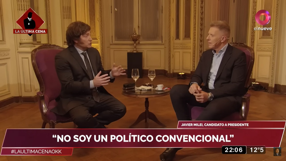 Según el «doctor» Nelson Castro, en El Trece, «una nueva generación de outsiders llega a través de este fenómeno de las redes y demás». Dicen que su circulación en Tik-Tok equivale a 580 puntos de rating. Con Fantino, la familiarity se vuelve concesión, de parte del antes jefe que lo tenía de columnista en Animales sueltos: «Sería hipócrita de mi parte; yo te conozco; te tengo que decir como siempre». A lo que Milei responde: «Si tu amigo cambia de trabajo, ¿lo llamarías de otra manera?».