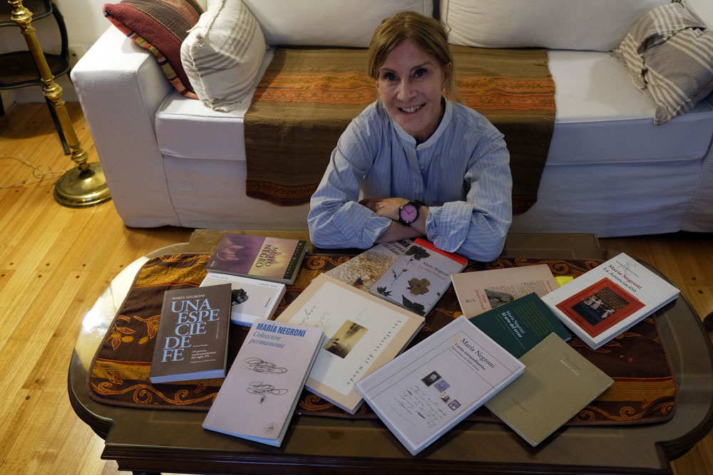 Poesía, ensayo, novela, la obra de María Negroni se despliega desde 1985 con su primerísimo libro de poemas, De tanto desolar, publicado por Libros de Tierra Firme. Y acaba de engrosarse con Colección permanente (Random House), un extraño artefacto que combina el manifiesto, el reportaje apócrifo, las memorias, la cita literaria y la imaginación, para ofrecer, quizás, su apuesta más personal después de El corazón del daño. Además de ese texto en prosa, acaba de publicar Utilidad de las estrellas en España, donde obtuvo el Premio Internacional de Poesía Margarita Hierro.